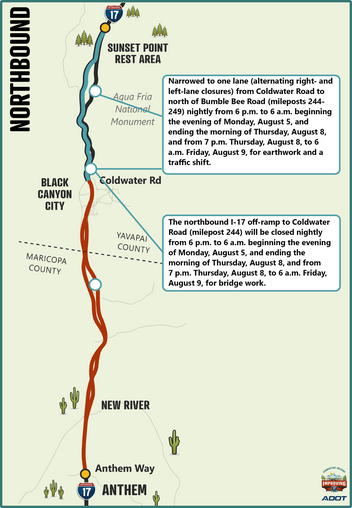 Meanwhile, northbound I-17 will be reduced to one lane between Bumble Bee Road and Coldwater Road to accommodate earthwork and bridge work.