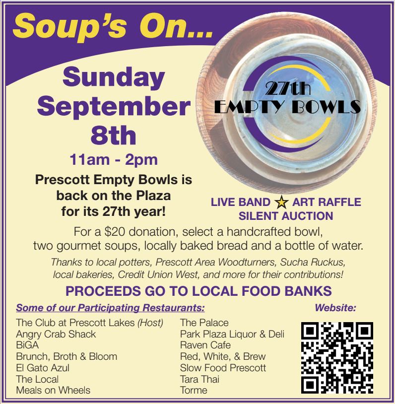 Have some soup, and help those who are hungry. Prescott Empty Bowls takes place Sunday from 11 a.m. to 2 p.m. at the Courthouse Plaza. For a 20 dollar donation, you get a handcrafted bowl and two gourmet soups. An art raffle and silent auction will also take place. The money raised will go to local food banks.