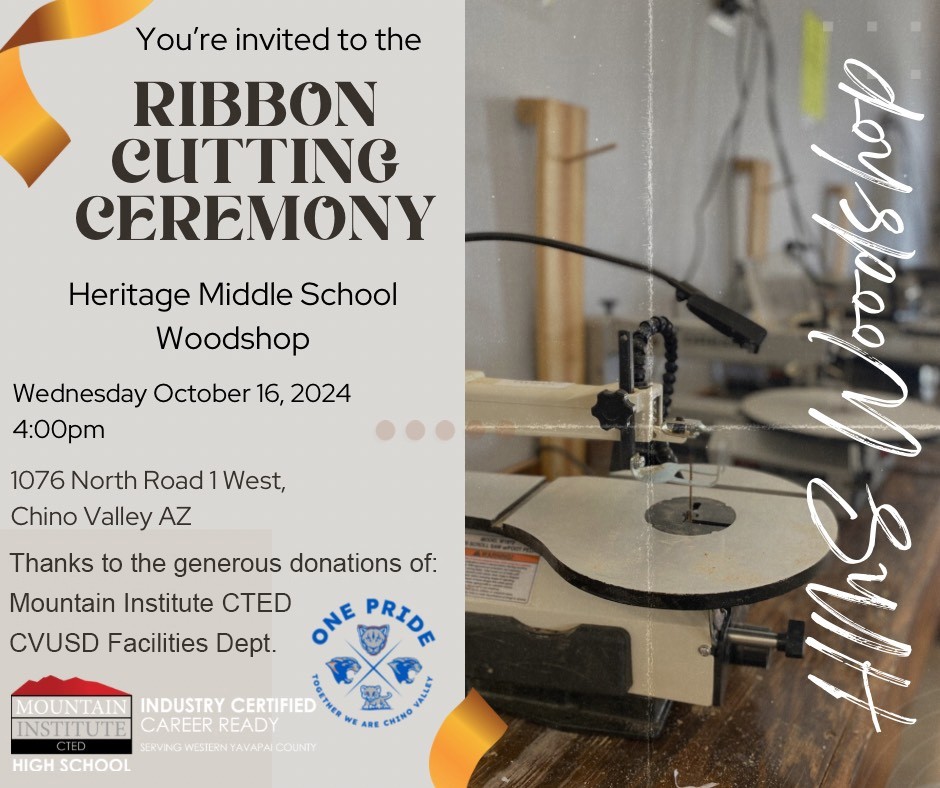 The Chino Valley Unified School District wants to show off the newly expanded woodshop at Heritage Middle School to the community. A ribbon-cutting ceremony is scheduled for October sixteenth at 4 p.m.