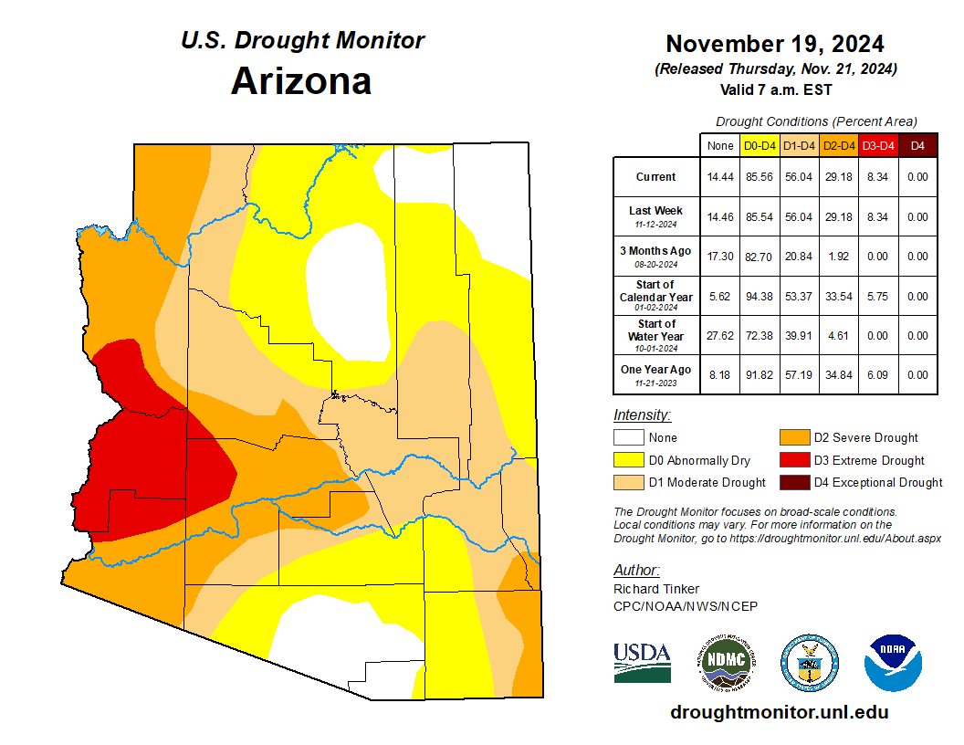 As for the rest of the state, much of Northern Arizona is abnormally dry or in moderate drought. The eastern and central areas of the state are in either severe drought or moderate drought.