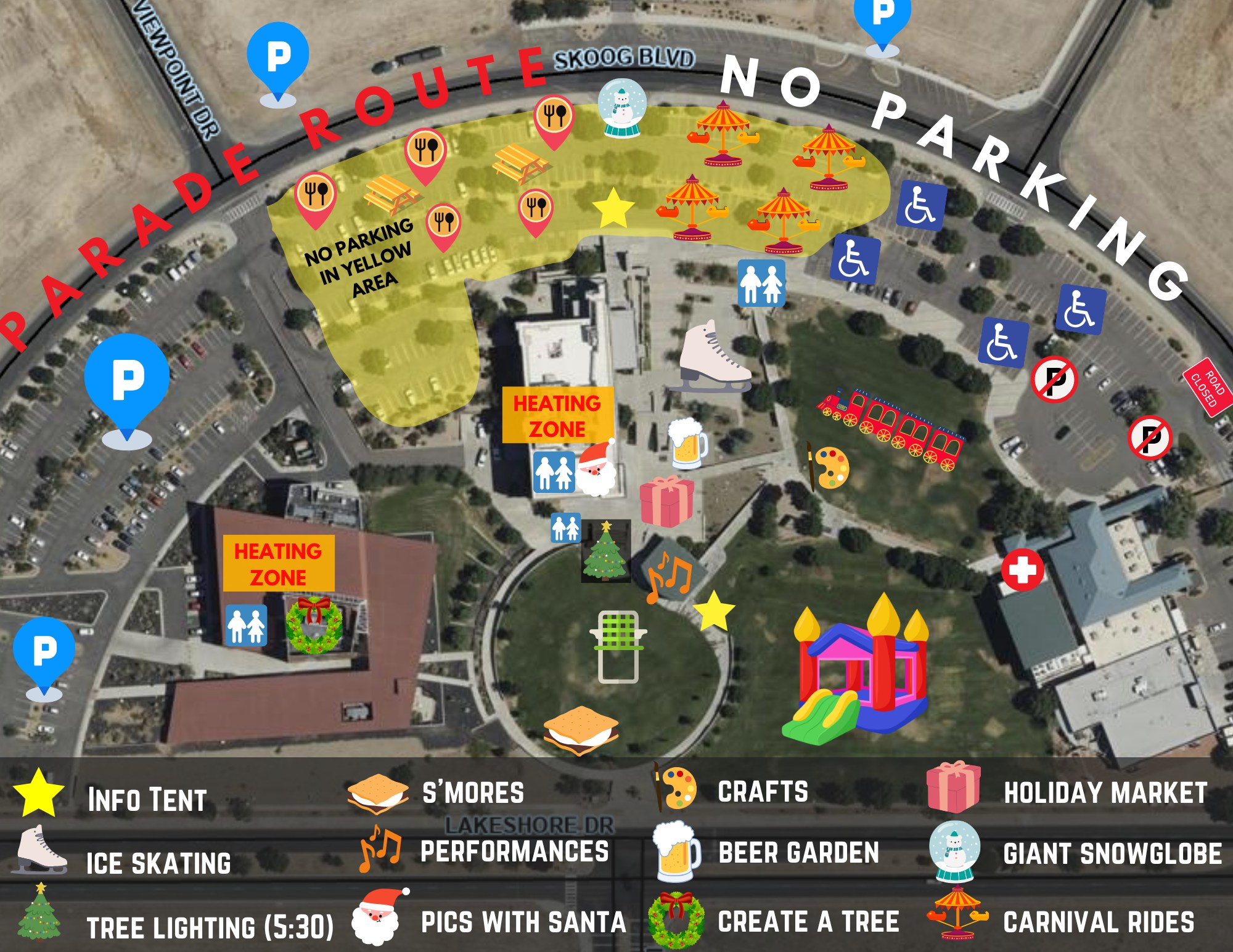 The Civic Center parking lot will be closed from 5 a.m. Friday until 3 p.m. Sunday. Skoog Boulevard, the parade route for the Winter Spectacular, will be closed Saturday from 5 a.m. to 10:30 p.m.