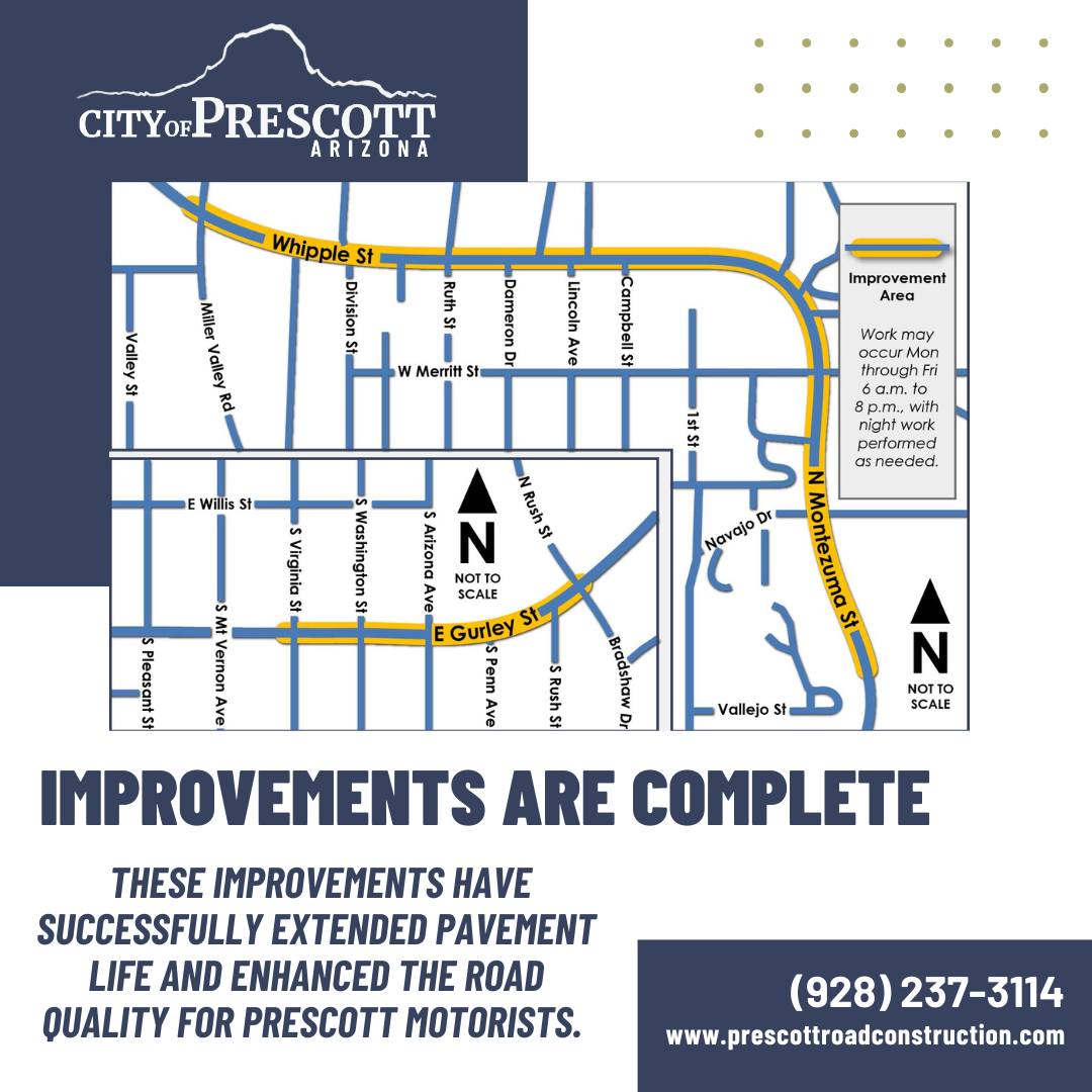 The City of Prescott’s 2025 Pavement Preservation Project has been completed. The city’s contractor, Cactus Asphalt, performed maintenance and preservation operations on Gurley Street, Whipple Street, and Montezuma Street.