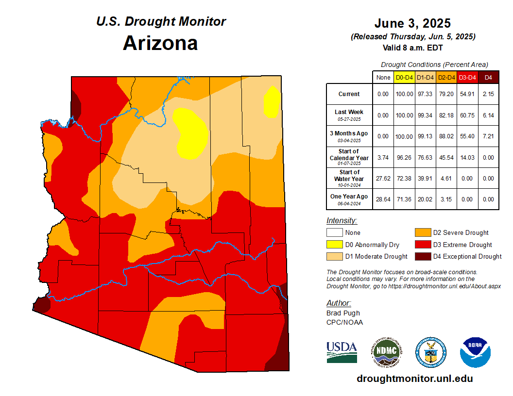 As for the rest of the state, nearly three-quarters of Arizona is in either severe drought or extreme drought. A sliver of southeastern Arizona is in exceptional drought. Last week, much of that section of the state was in exceptional drought. Most of northern Arizona is in moderate drought.
