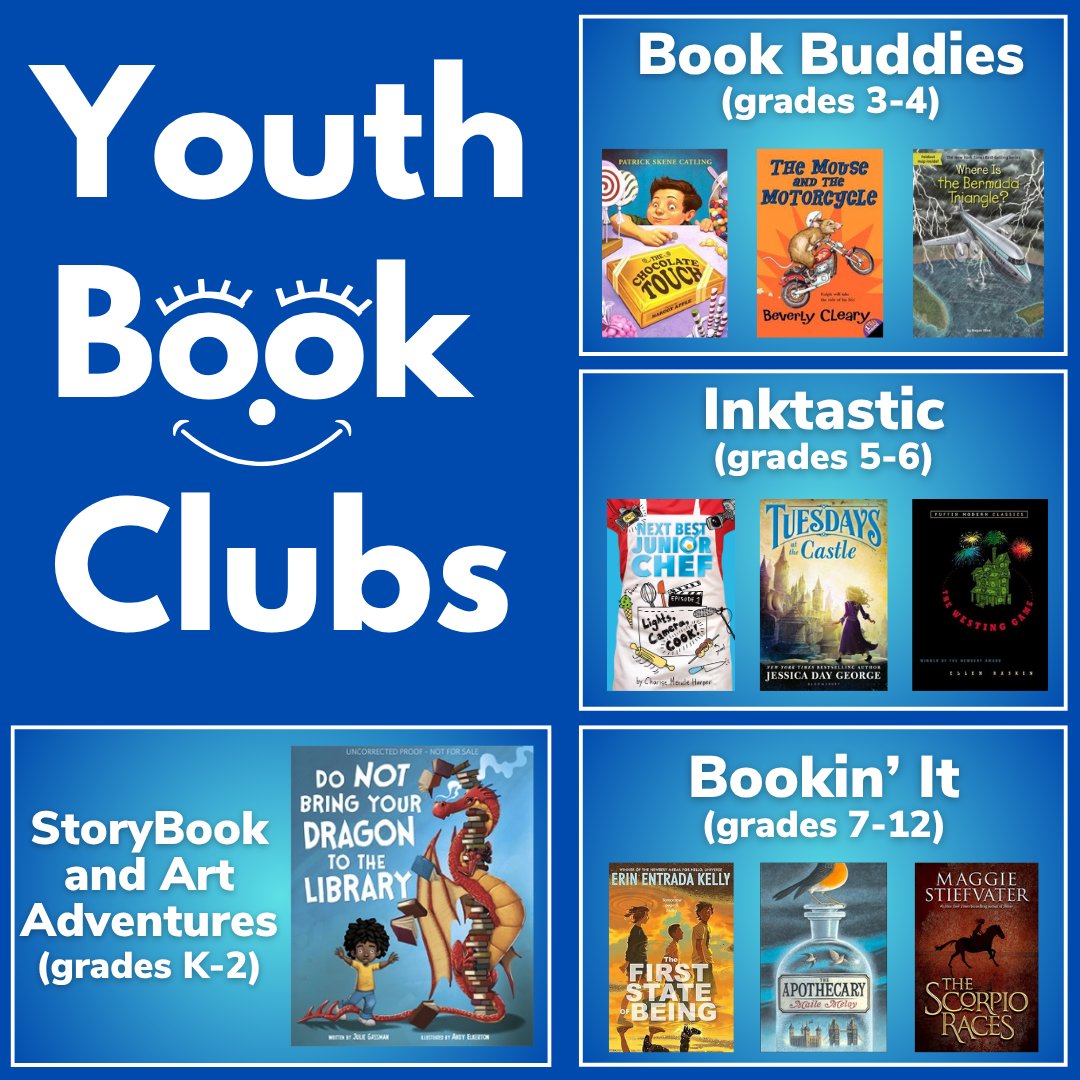 The clubs are Storybook and Art Adventures for grades K-2, Book Buddies for Kids for grades 3 and 4, InkTastic for Tweens for grades 5 and 6, and Bookin’ It for Teens for grades 7–12.