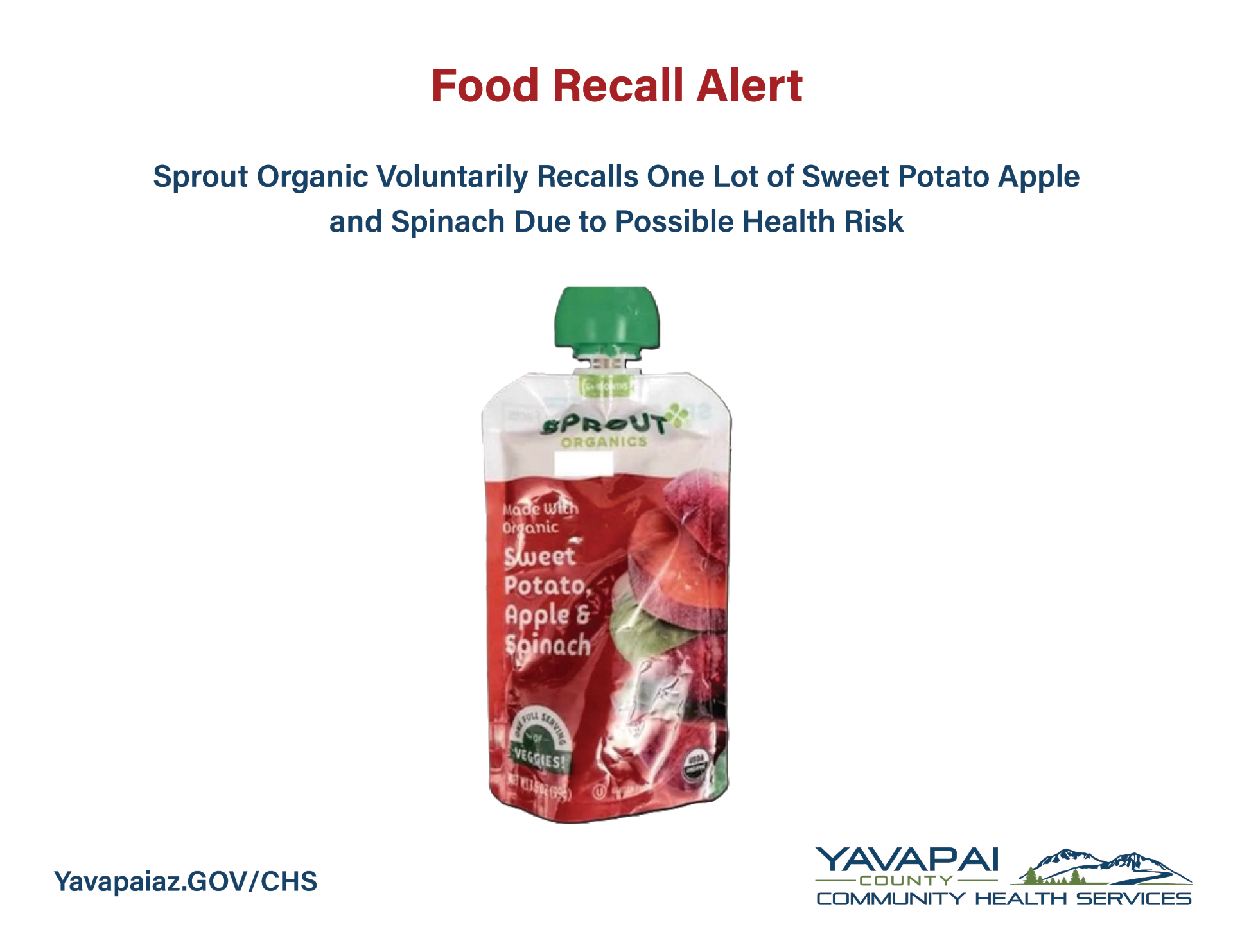 Yavapai County Community Health Services is alerting the public to another food recall. Sprout Organics has issued a voluntary recall of its sweet potato, apple, and spinach baby food pouches, citing possible elevated levels of lead.