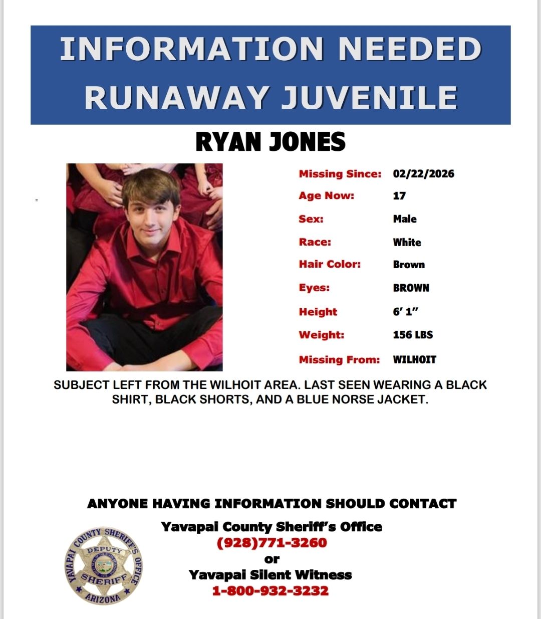 Officials with the Yavapai County Sheriff’s Office are asking for the public’s help in locating runaway juvenile Ryan Jones. He went missing this past Sunday from the Wilhoit area. Jones was last seen wearing a black shirt, black shorts, and a blue Norse jacket. Jones is a 17-year-old white male with brown hair and brown eyes. He is 6 feet 1 inch tall and weighs 156 pounds.