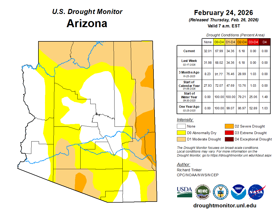 According to the U.S. Drought Monitor, just like the past few weeks, the eastern and central parts of the county are no longer in drought. Western Yavapai County is abnormally dry. As for the rest of Arizona, nearly half the state is either abnormally dry or no longer experiencing drought. Eastern Arizona is either in severe drought or moderate drought.