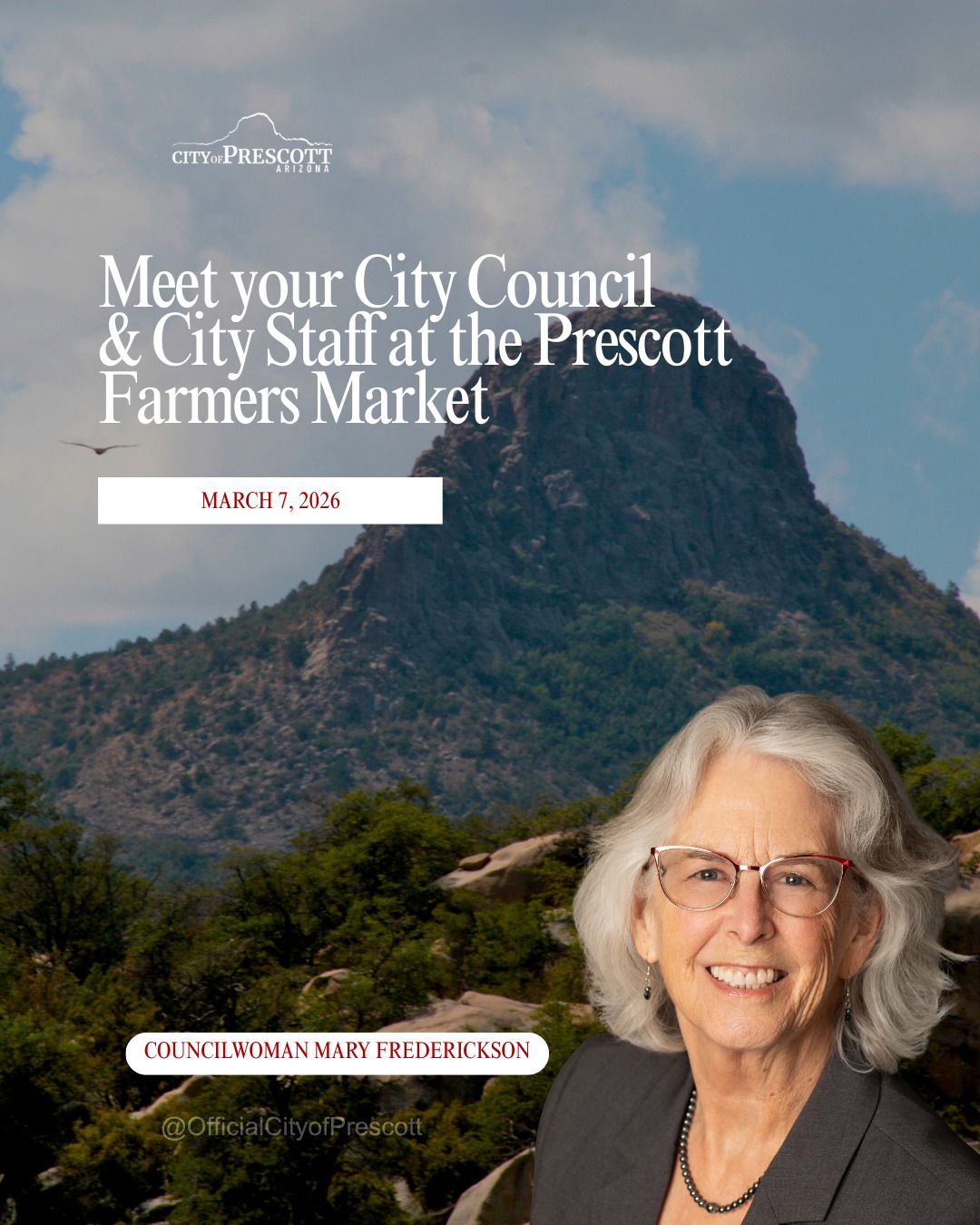 The City of Prescott is continuing its “Meet Your City Council and City Staff at the Prescott Farmer’s Market” program. This Saturday, Councilwoman Mary Frederickson will be at the Prescott Farmer’s Market, along with the Neighborhood Services team.